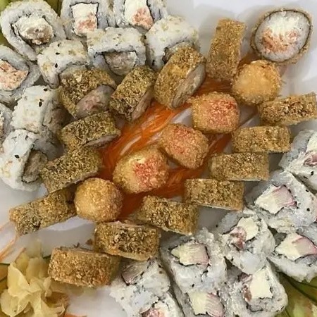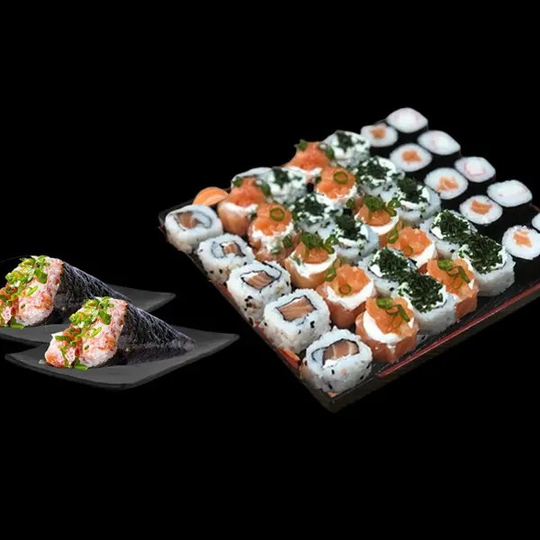 20 peças Uramaki e/ou Cariocas sortidas (Salmão, Camarão, Kani e Pasta de Salmão) + Temaki Misto (Alga + Arroz + Cream Cheese + Camarão + Kani + Salmão) a escolha do chefe recheio das peças e dos temakis