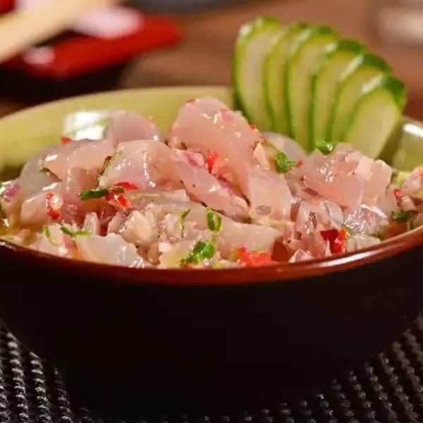 Frutos de Mar, salada marinada com limã e molho de pimenta.