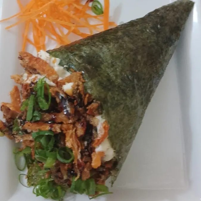 Temaki misto (Alga + Arroz + Cream Cheese + Camarão + Kani + Salmão ou pasta de salmão) escolhas do chefe.