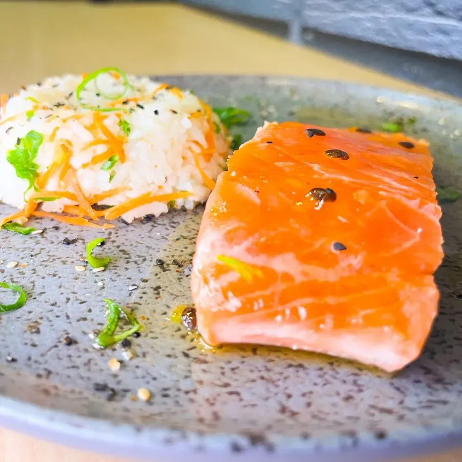 Salmão grelhado ao molho de maracujá, acompanha arroz.