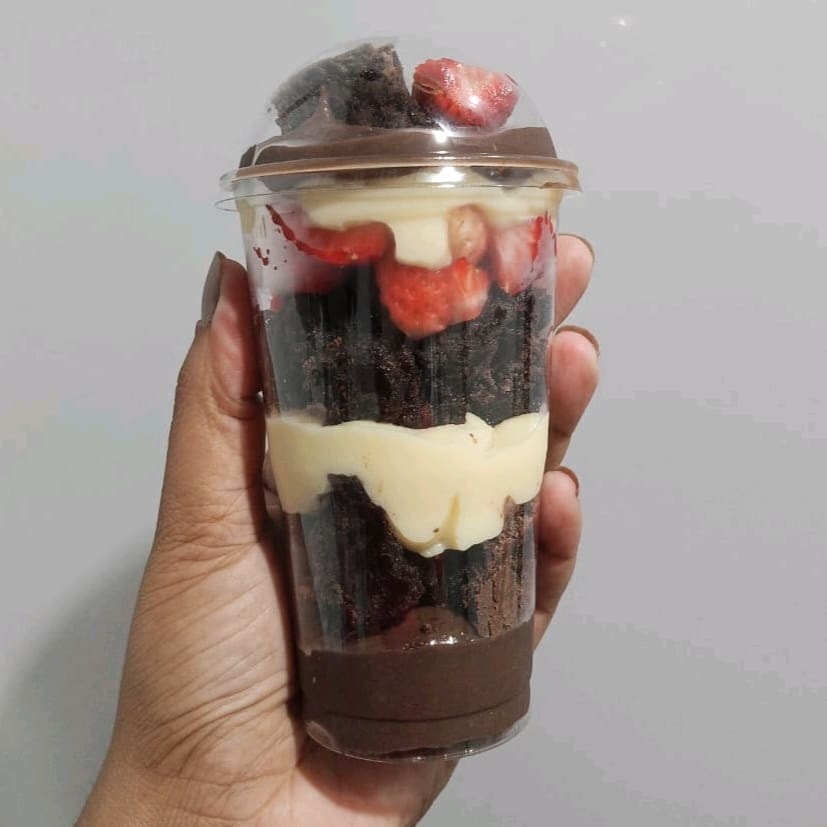 Combinação de sabores de brigadeiro cremoso de Ninho e chocolate 50% Cacau, com brownie e morangos frescos.