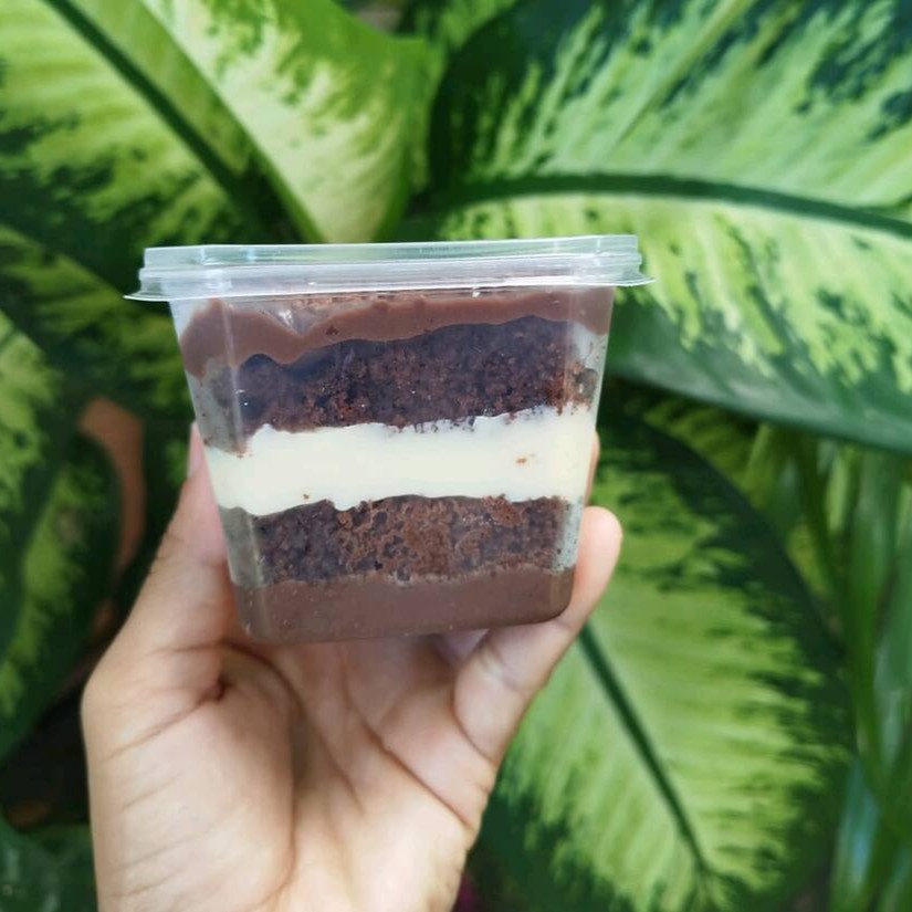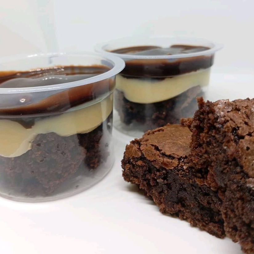 Brownie com aquela famosa casquinha, camadas de brigadeiro cremoso de ninho e de chocolate, finalizado com Brownie.