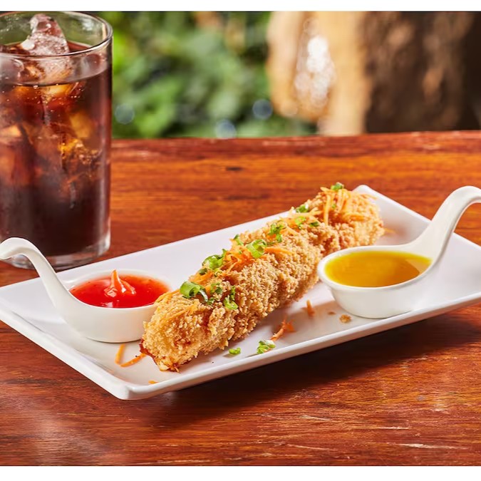 Roll de camarão empanado, cream cheese e arroz por fora.