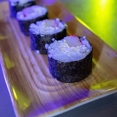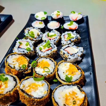 Uma deliciosa combinação de 10 cariocas salmão, 10 cariocas camarão, 10 hossomaki de camarão, 10 uramakis de kani e 10 hossomaki de kani.