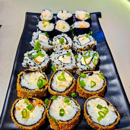 10 uramakis de kani + 10 uramakis de camarão + 10 hossomakis de kani + 10 hossomakis de camarão finalizados com cebolinho. Acompanha molho Shoyou e Teriyaki + Geléia de pimentar artesanal a parte!