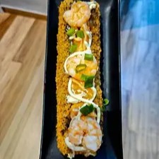 10 cariocas recheados com salmão e cream cheese, empanado e frito até ficar crocante finalizado com mais cream cheese e camarão por cima! Uma explosão de sabor em cada mordida!