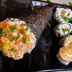 1 Temaki de camarão ( empanado ou natural ) + 10 cariocas de Salmão + 1 coca lata