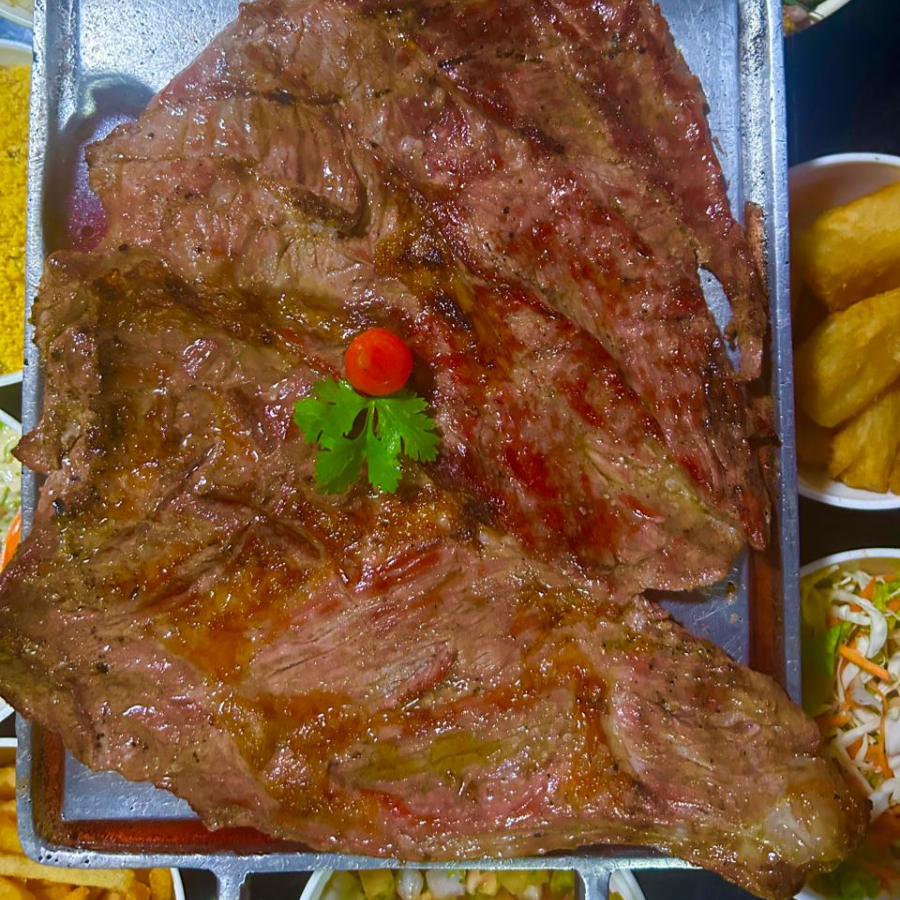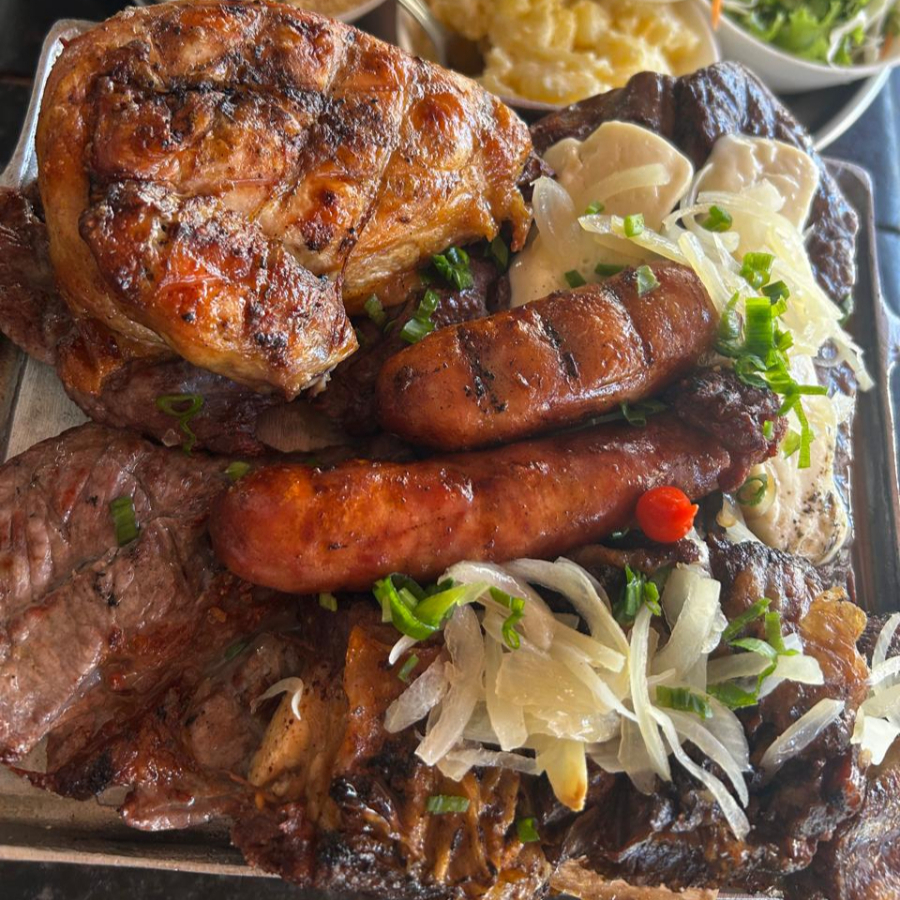 C/ Maminha, carne de sol, costela no bafo, galeto e toscana e Acompanhamentos: arroz, feijão tropeiro, batata frita, farofa, vinagrete e macaxeira.