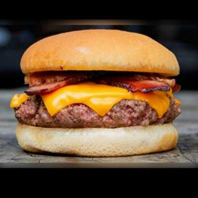 Pão selado na manteiga de garrafa, hambúrguer de Cupim assado na brasa, cheddar, bacon na brasa e molhos.