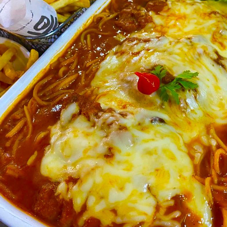 Acompanha: Espaguete e batata frita