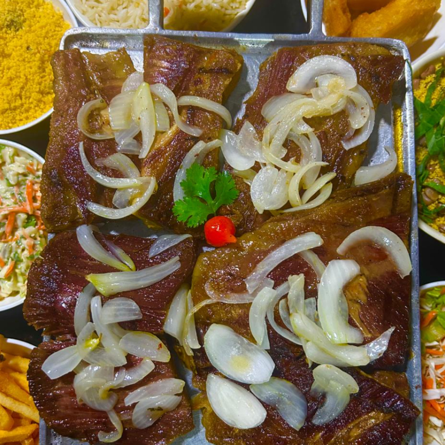 Acompanhamentos: arroz, feijão tropeiro, batata frita, farofa, vinagrete e macaxeira frita.