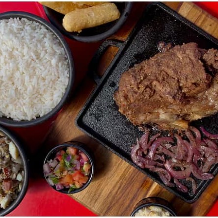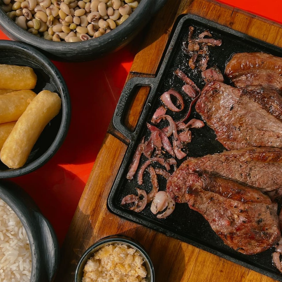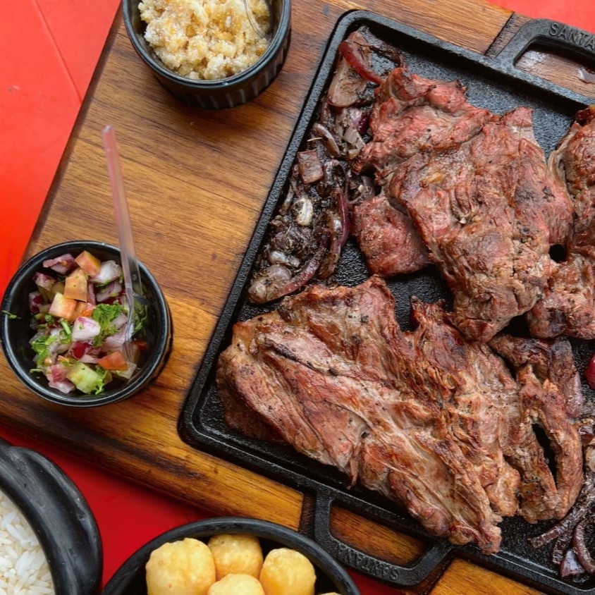 Acompanhada por feijão caipira (com ovos), cuidadosamente temperados. O arroz branco soltinho, a macaxeira frita crocante e a farofa rica em sabor complementam a refeição. Para finalizar, o vinagrete fresco. trazem um toque especial ao prato. Entregamos essa delícia quentinha e saborosa no conforto da sua casa.