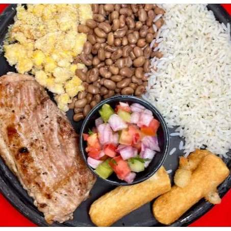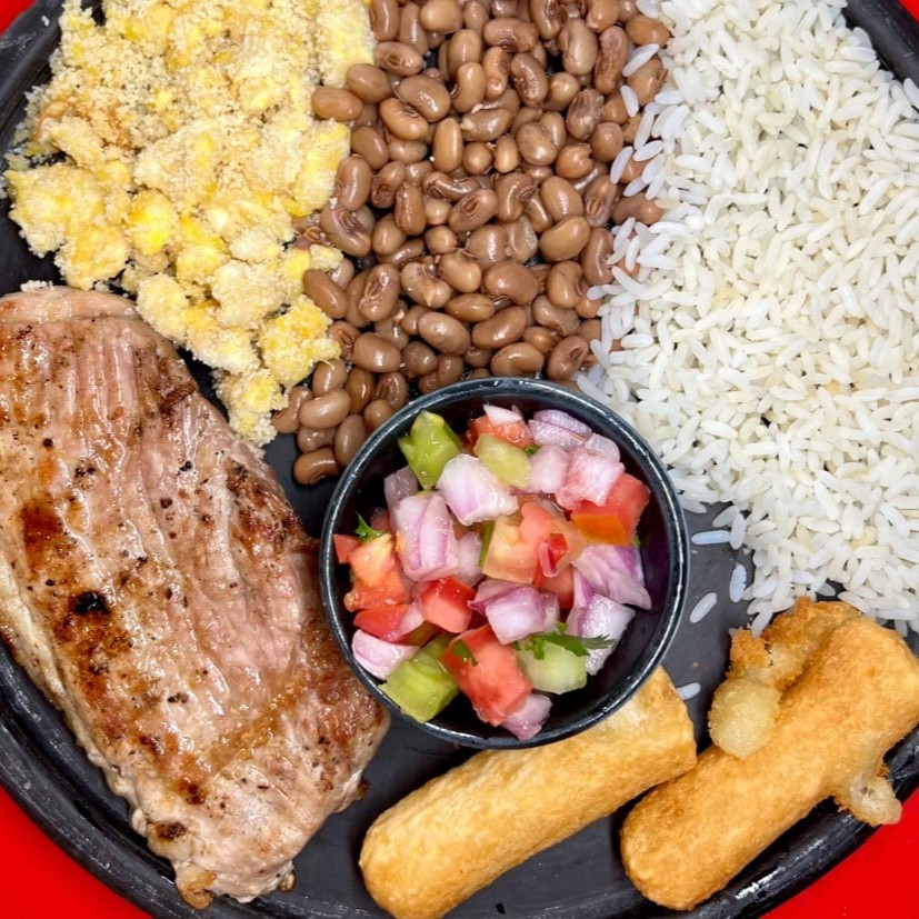 Este prato é composto por um feijão caipira (com ovos)bem temperado, arroz soltinho, macaxeira frita crocante, farofa irresistível, vinagrete fresquinho.