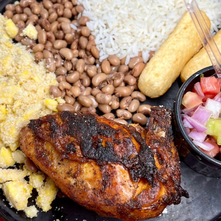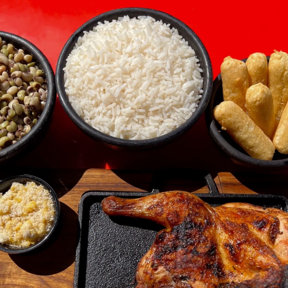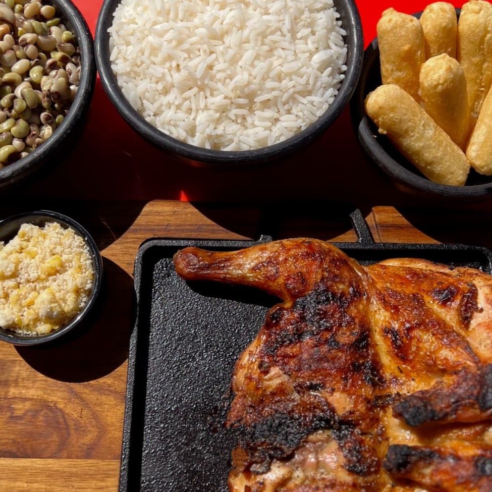 Nosso galeto, assado à perfeição na brasa, é acompanhado de feijão caipira (com ovos), arroz soltinho, macaxeira frita crocante, farofa temperada e o toque especial do vinagrete. , trazendo a você e sua família um sabor acolhedor e inesquecível, no conforto de sua casa. Desfrute de uma refeição quentinha e irresistivelmente saborosa.