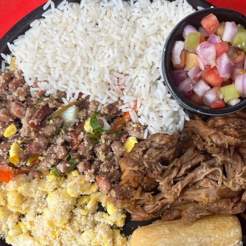 TFeijão caipira (com ovos), arroz , macaxeira frita, farofa e vinagrete.