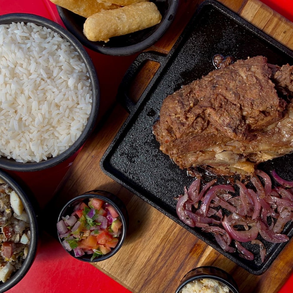O prato é composto por uma suculenta costela no bafo, acompanhada de feijão caipira (com ovos), repleto de texturas e sabores. O arroz soltinho é o companheiro perfeito para equilibrar a refeição. Já a macaxeira frita traz um toque crocante e irresistível ao prato. A farofa e o vinagrete fresquinho adicionam uma explosão de sabor, criando uma experiência gastronômica completa e satisfatória.