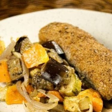 Kafta de carne de sol com legumes assados ao forno.