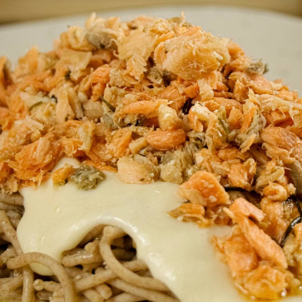 Massa integral com salmão suculento ao molho branco cremoso.