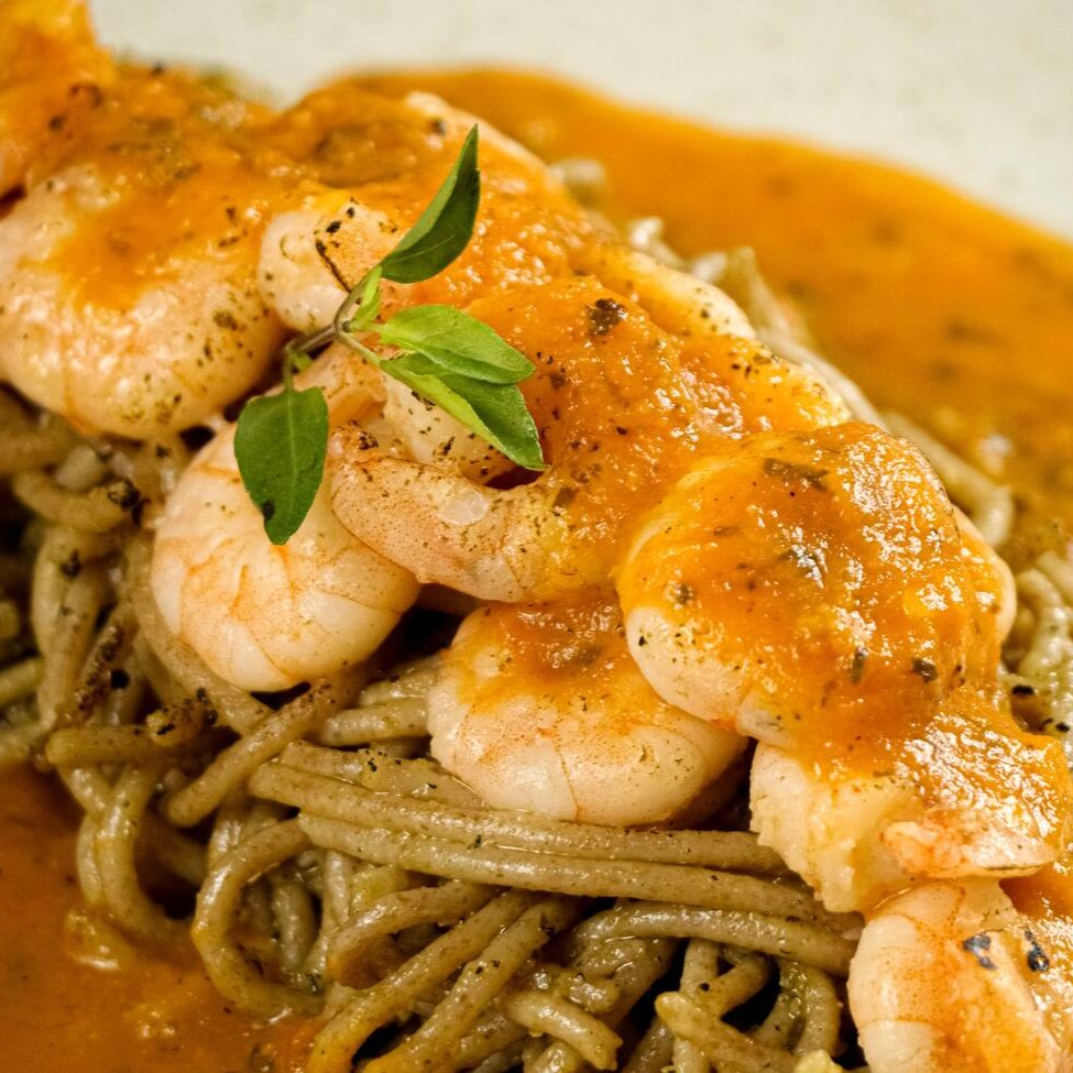 Massa integral com camarões frescos ao molho pesto aromático.