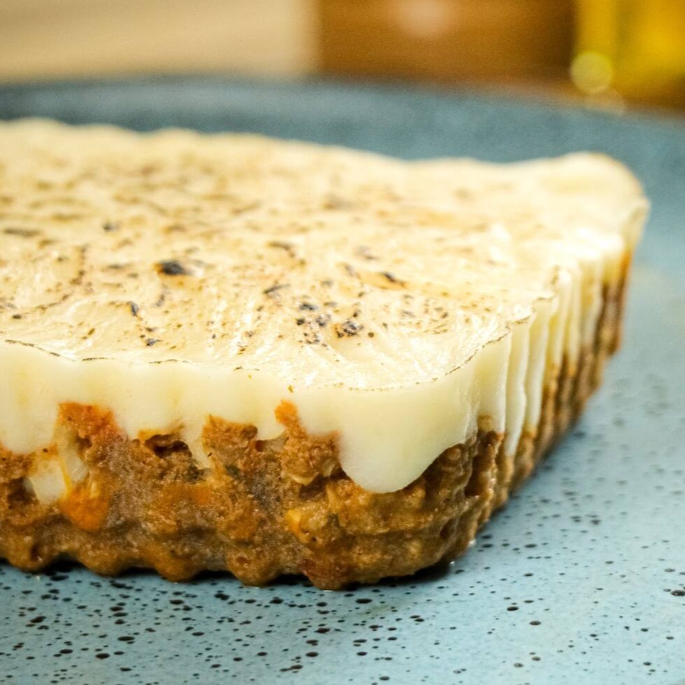 Escondidinho de carne com purê de macaxeira cremoso.
