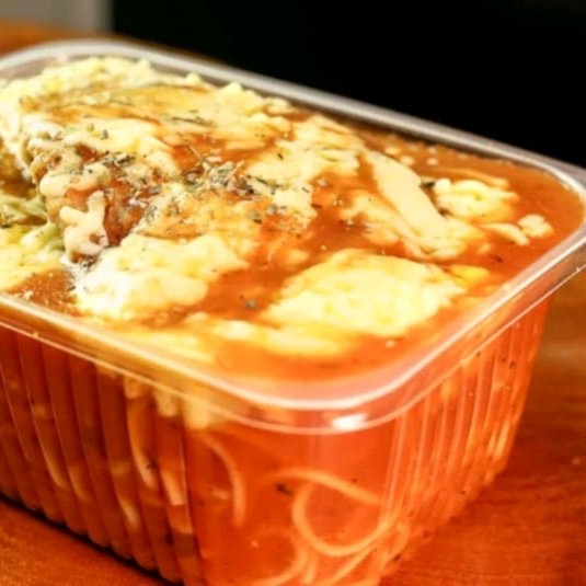 Suculento molho de tomate da casa, peito de frango empanado, queijo derretido.