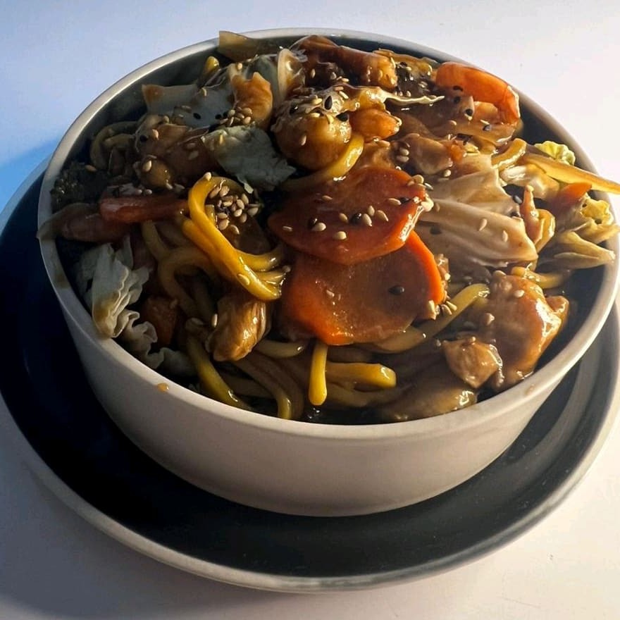 Macarrão especial,frango em cubos, vegetais sempre fresquinho, legumes puxado no wok chinês coberto com o nosso exclusivo molho yakisoba de dar água na boca!