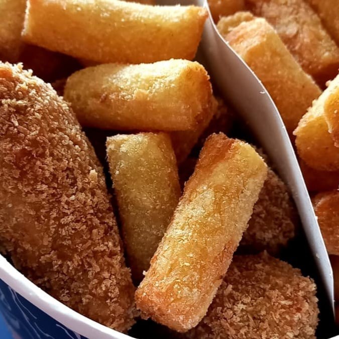Porção Com 10 Unidades + 350 G De Fritas ou rolinhos de macaxeira colocar na observaçao