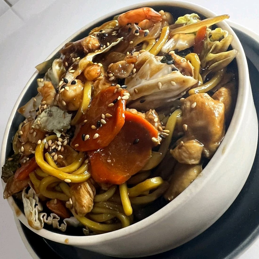 Macarrão especial,camarões,vegetais sempre fresquinho, legumes puxado no wok chinês coberto com o nosso exclusivo molho yakisoba de dar água na boca!