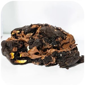 Massa black (100% cacau black), com gotas de chocolate branco e chocolate ao leite, recheada com biscoito Oreo triturado e muuuuita Nutella. Aprox. 100g