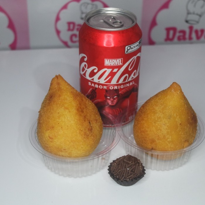 2 coxinhas Frango na farinha panko 1 Brigadeiro 1 refri lata