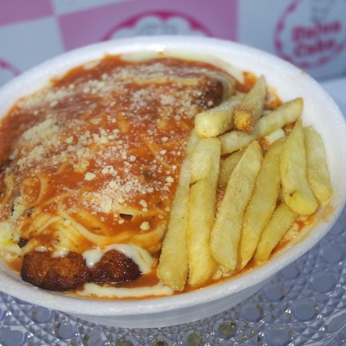 Macarrão espaguete , com molho artesanal de tomate , queijo ralado, frango empanado e batata fritas