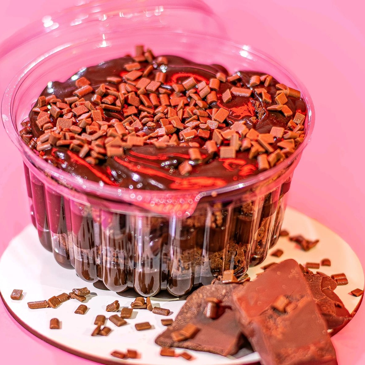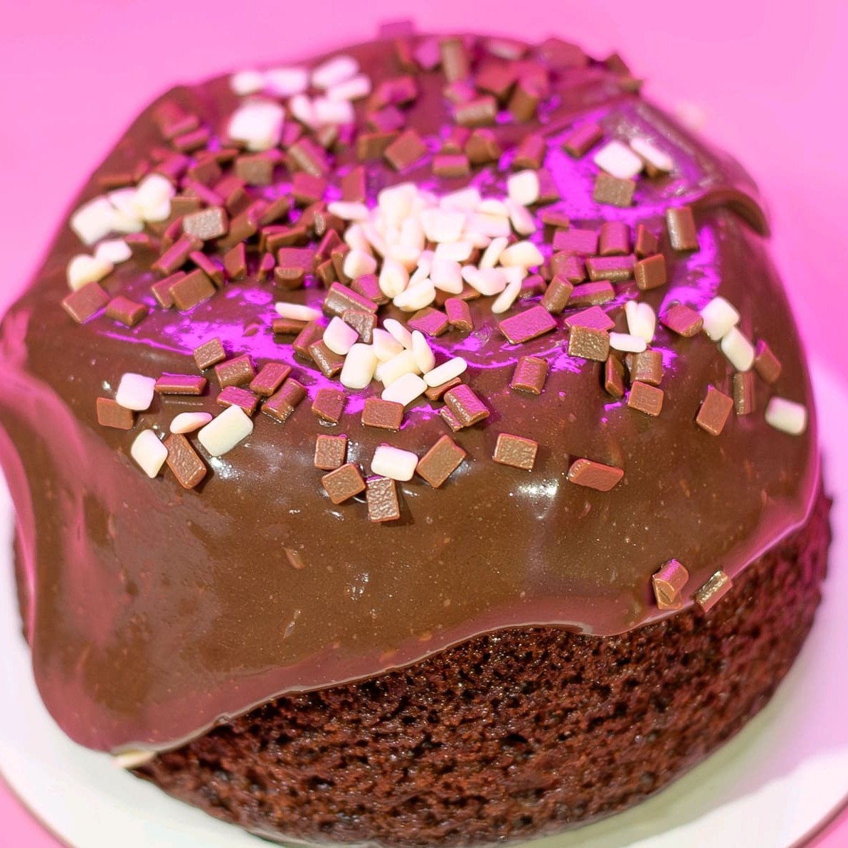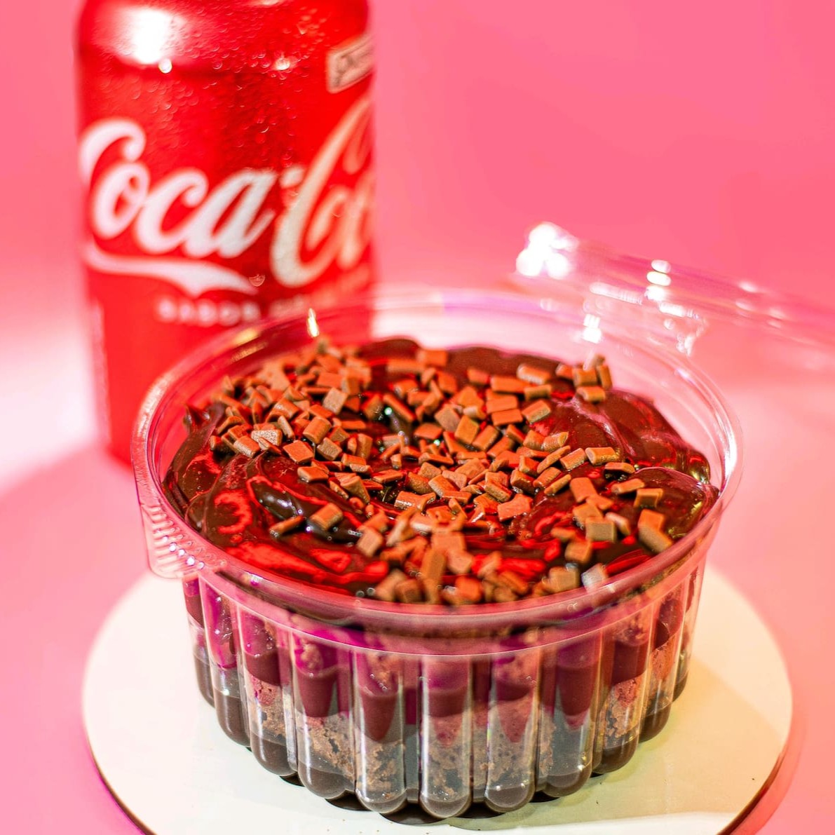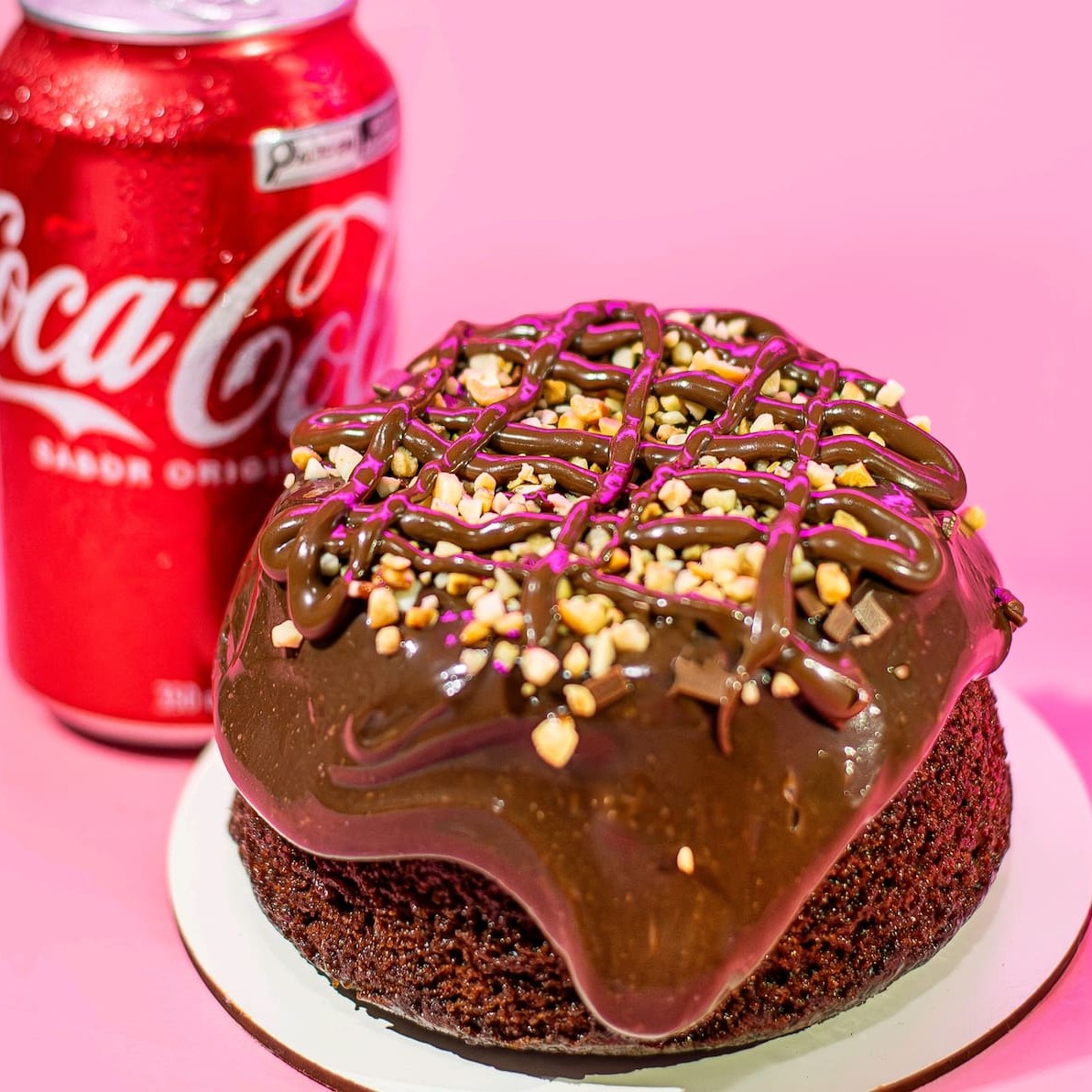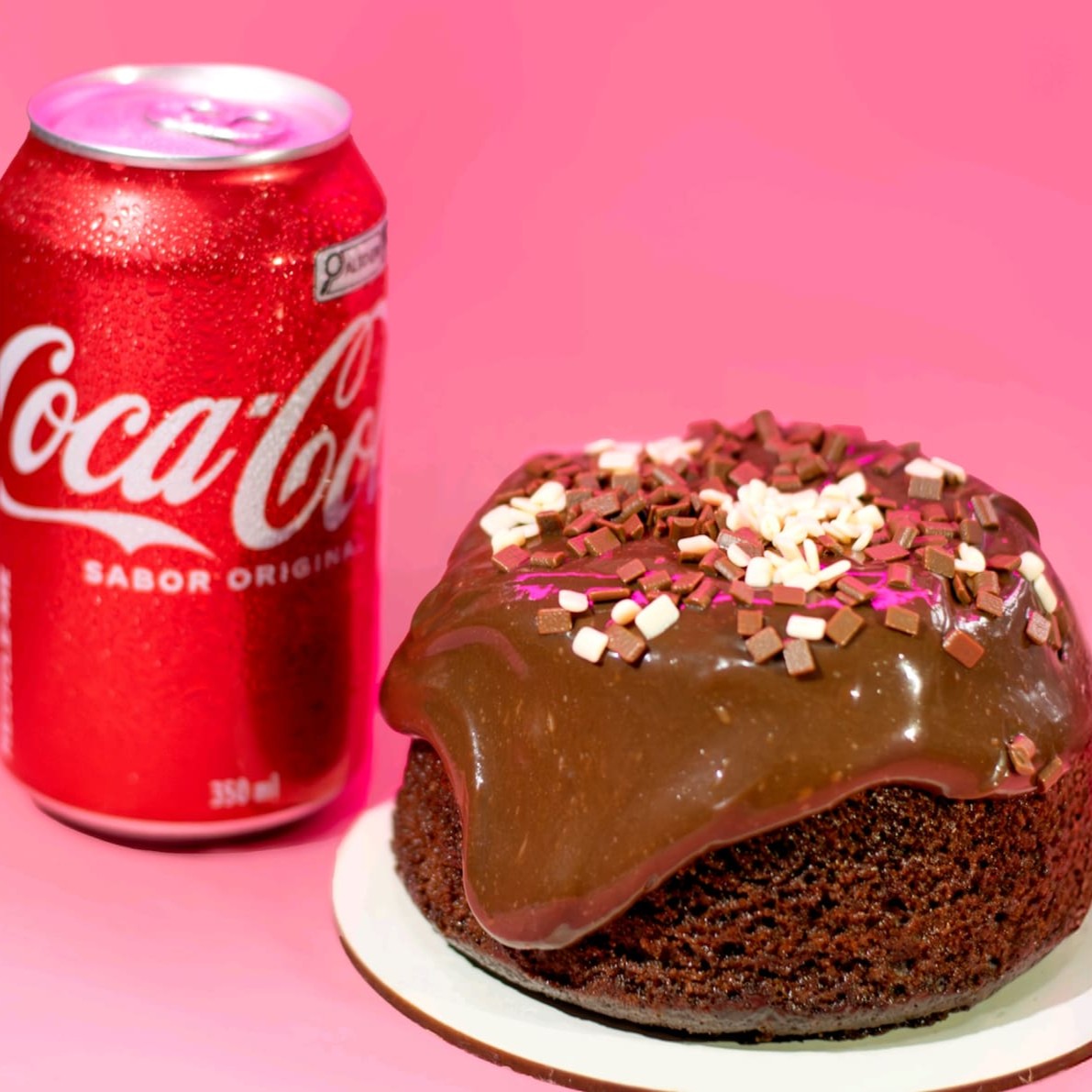 Bolo vulcão de chocolate massa e recheio de chocolate 50% cacau finalizado com deliciosos granulados granulê 400g + uma coca -cola em lata 350ml.. serve até 2 pessoas...