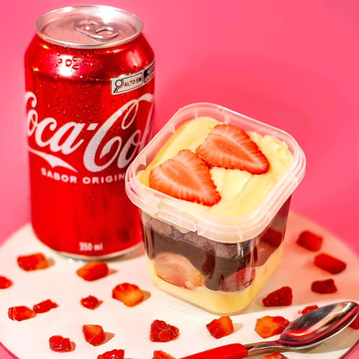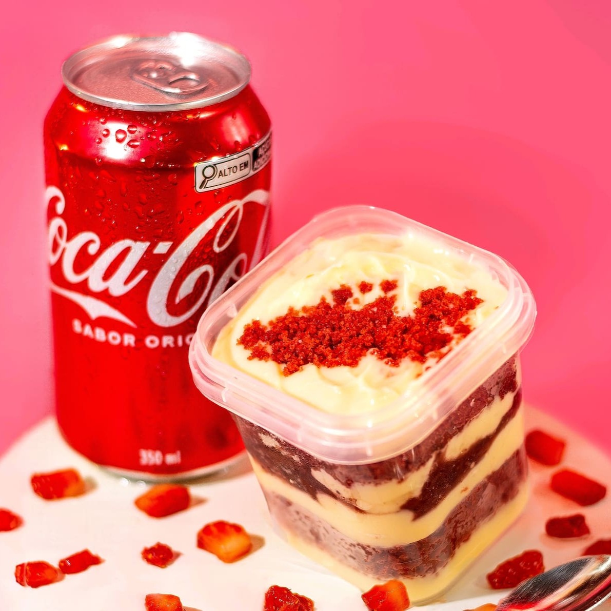 Um maravilhoso bolo no pote red velvet . Com um cremoso recheio de brigadeiro branco com deliciosos morangos assados 220g + uma Coca-Cola lata 350ml serve até 1 pessoa
