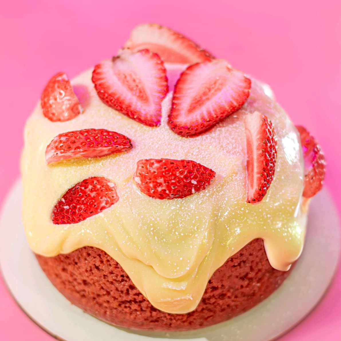 Bolo vulcão red Velvet com recheio de morangos assados e um cremoso brigadeiro de Ninho e pedacinhos de morangos frescos em cima... 400 g. serve até 2 pessoas
