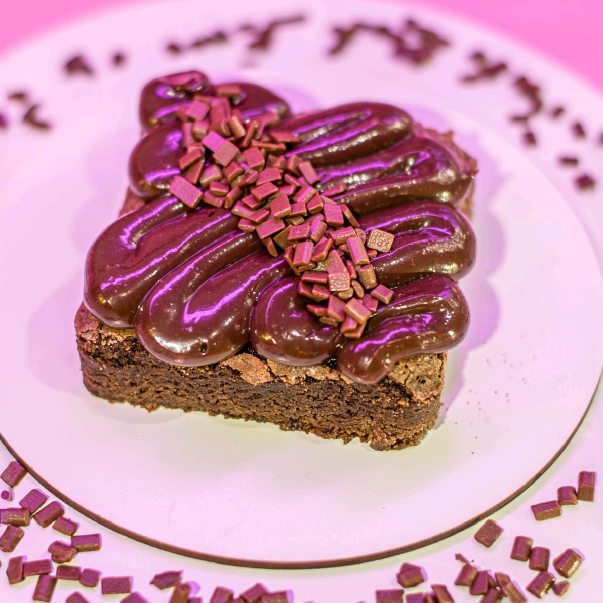 Maravilhoso brownie com brigadeiro cremoso de chocolate 50% cacau finalizado com granulado granulê. 120g. serve até 1 pessoa