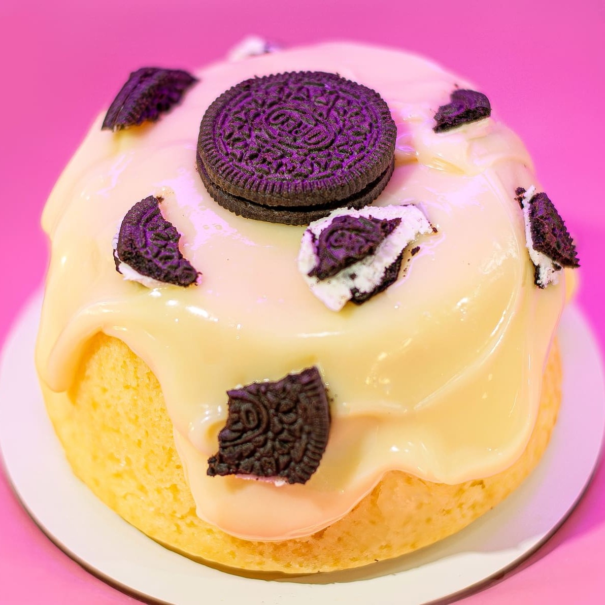 Bolo vulcão com massa de baunilha com um cremoso recheio de brigadeiro branco e pedacinhos de biscoito Oreo 400 g. serve até 2 pessoas..