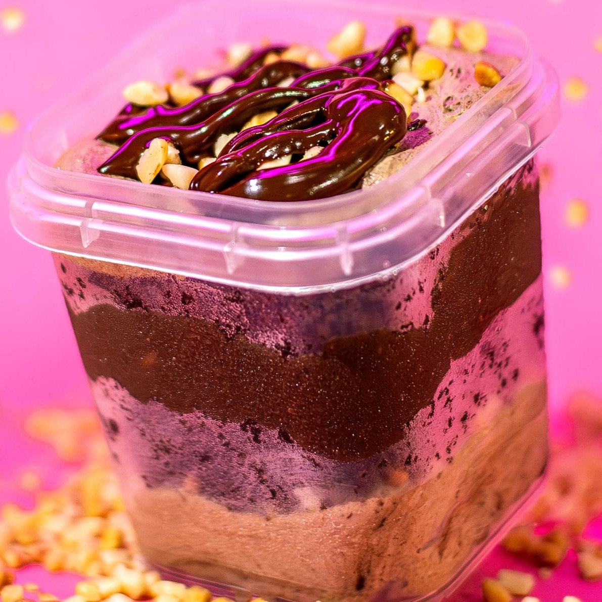 A combinação de uma massa de chocolate com mousse de ferrero Rocher e brigadeiro de chocolate 50% cacau , finalizado com pedacinhos de amendoim, fica uma explosão de sabor! 220 g. serve 1 pessoa