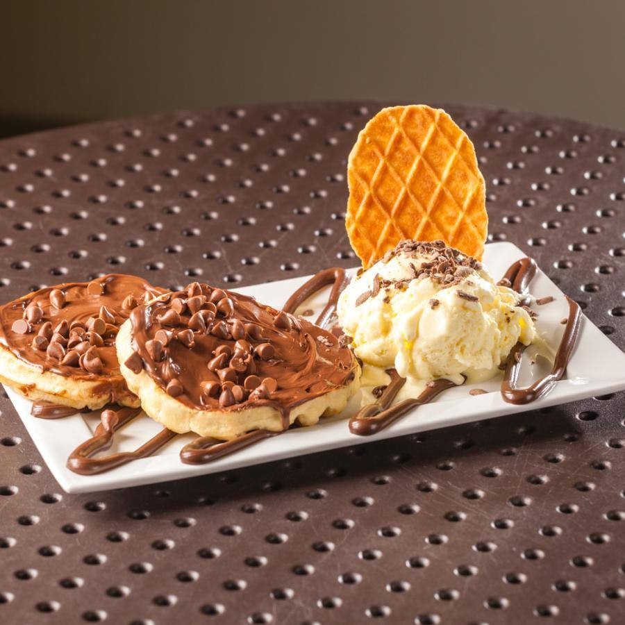 Dois pedaços de waffle quentinhos. Acompanha bola de sorvete de baunilha especial, com mescla de chocolate com avelã e raspas de chocolate.