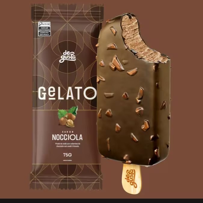 Sorvete de avelã com recheio de creme de avelã crocante e cobertura de chocolate com avelãs. Você merece vivenciar a experiência dos Novos Gelatos Degusta.