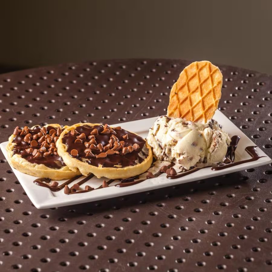 Dois pedaços de waffle quentinhos. Acompanha uma generosa bola do sorvete de nino trufado com mescla de chocolate trufado.