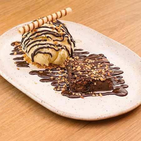 Brownie, calda de doce de leite e farofa de Farinha Láctea crocante, com uma bola de sorvete de baunilha especial.