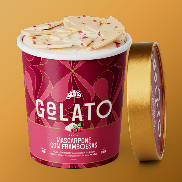Sorvete sabor nata italiana com recheio de framboesa e cobertura crocante de chocolate branco com frutas vermelhas. Você merece vivenciar a experiência dos Novos Gelatos Degusta.