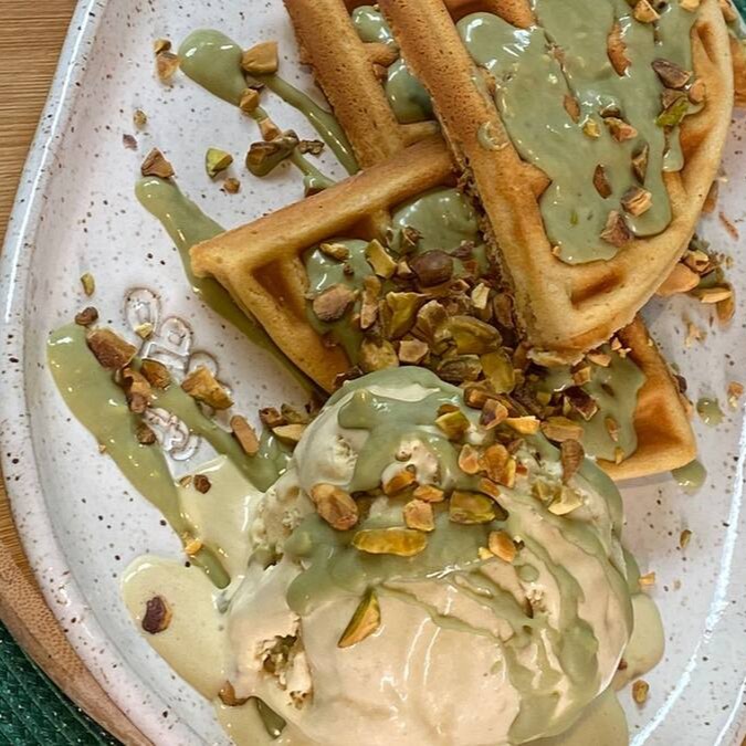 Delicioso waffle com sorvete de pistache e calda de pistache.
