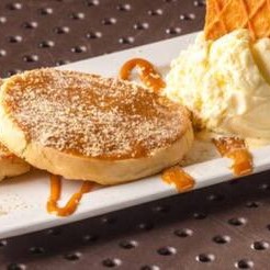 Deliciosa massa de waffer com doce de leite coberto com Farinha Láctea acompanhado de uma bola de sorvete de baunilha especial.