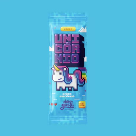 Picolé de chantilly azul com casquinha de chocolate rosa, granulados coloridos e recheado com chocolate ao leite.
