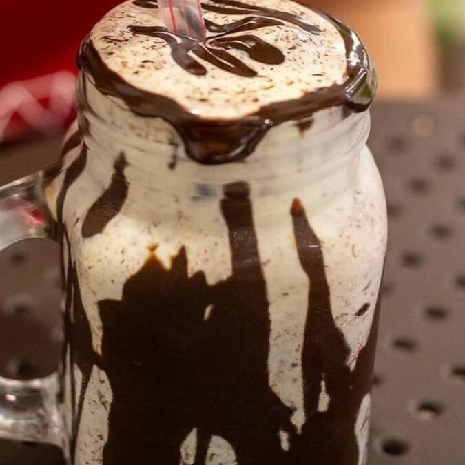 Milkshake de pistache com calda de pistache.