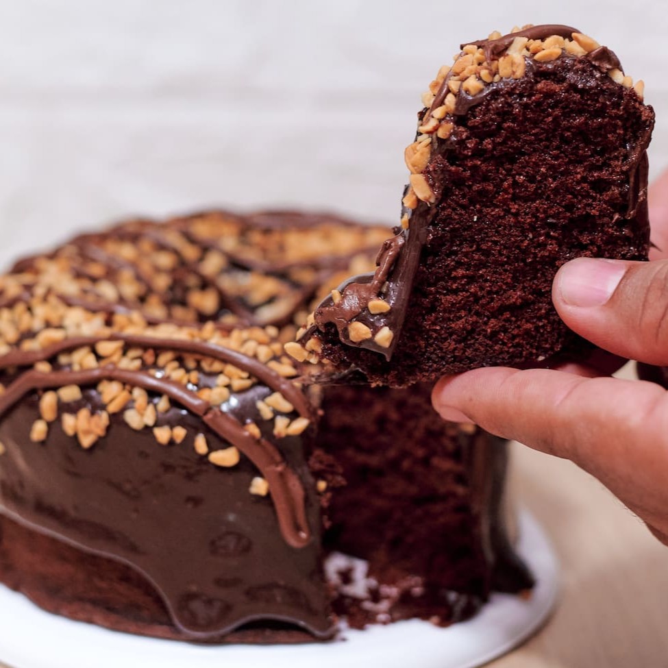 Fofinho, úmido e irresistível! Massa de chocolate, cobertura cremosa, crocância do amendoim triturado e finalização com creme de avelã. Uma explosão de sabor para ninguém botar defeito. Rende em média 8 fatias (aprox. 700g).