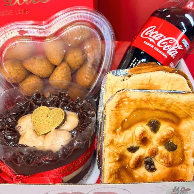 O nosso Delikit É muito amor é o presente perfeito para comer acompanhado. Ideal para duas pessoas. É composto por: 1 torta Ppzinha (aproximadamente 600g), 2 empadas, 2 latinhas de coca cola, 2 copos dos sonhos, 6 trufas gourmet.