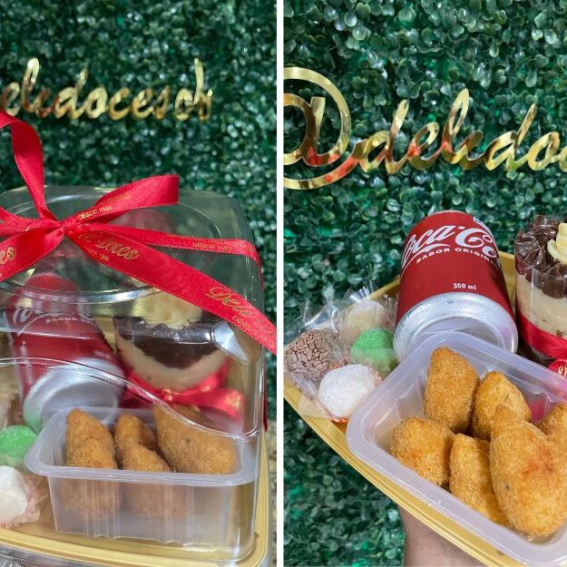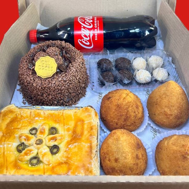A caixa presente é composta por: 1 mini torta de 300g, 6 coxinhas, 4 doces e 1 coca lata. Segue :