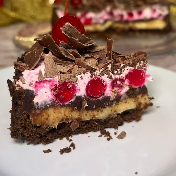 Base De Biscoito ( *esfarela na boca* ) A floresta negra leva um creme de cerejas rosas ao Rum, sob uma camada de creme de Ninho e outra e chocolate meio amargo, tudo por cima da base de biscoito.Segue :